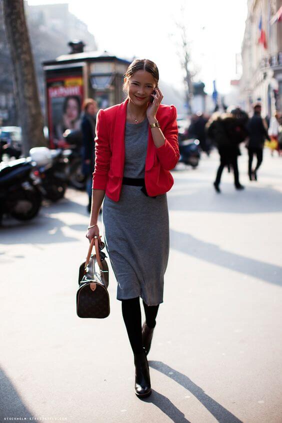 К классике относится красный+черный. Пиджак отлично будет смотреться поверх черного платья. Элегантный образ создаст красный приталенный пиджак, кремовая блузка и черный низ. При этом нужно подбирать глубокие черные тона.
