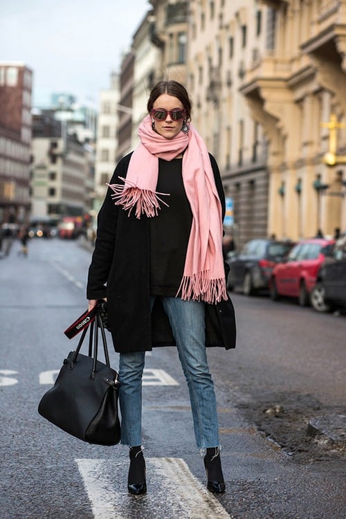 Классический длинный теплый шарф с бахромой сегодня стильно носится поверх пальто, свободно обвивая шею. Подбирайте яркие или контрастные оттенки, чтобы сделать шарф ярким акцентом в монохромном образе. Таким образом можно носить не только модель с бахромой, но и любой длинный однотонный шарф, платок или палантин.