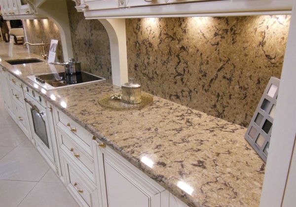Применение натуральных камней в оформлении кухни становится актуальным. Наиболее распространен керамогранит. Этот материал имеет матовую текстуру и закрытые поры, что упрощает уход за ним.