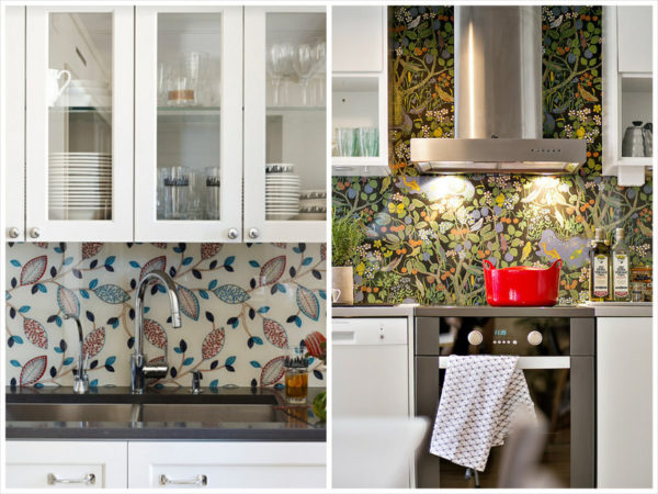 Использование для отделки кухни каленое стекло внесет в дизайн комнаты оригинальность и практичность. Все загрязнения можно будет легко убрать. Под стеклом можно разместить специальные обои, или декоративную штукатурку.