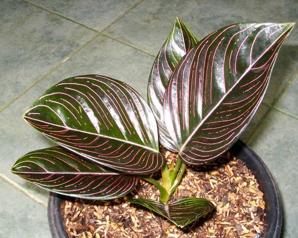 Декоративный вид, который не отличается большим ростом. Листья имеют форму сердца, немного заострены, окрашены в темный, насыщенный зеленый оттенок. Вдоль прожилок проходят полосы, которые придают пластинам необычного и очень яркого внешнего вида. Прожилки могут быть не только ослепительно белыми, но и ярко-малиновыми.