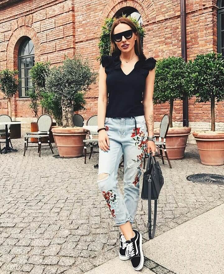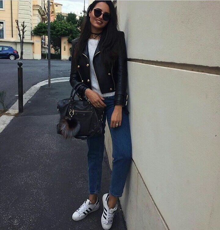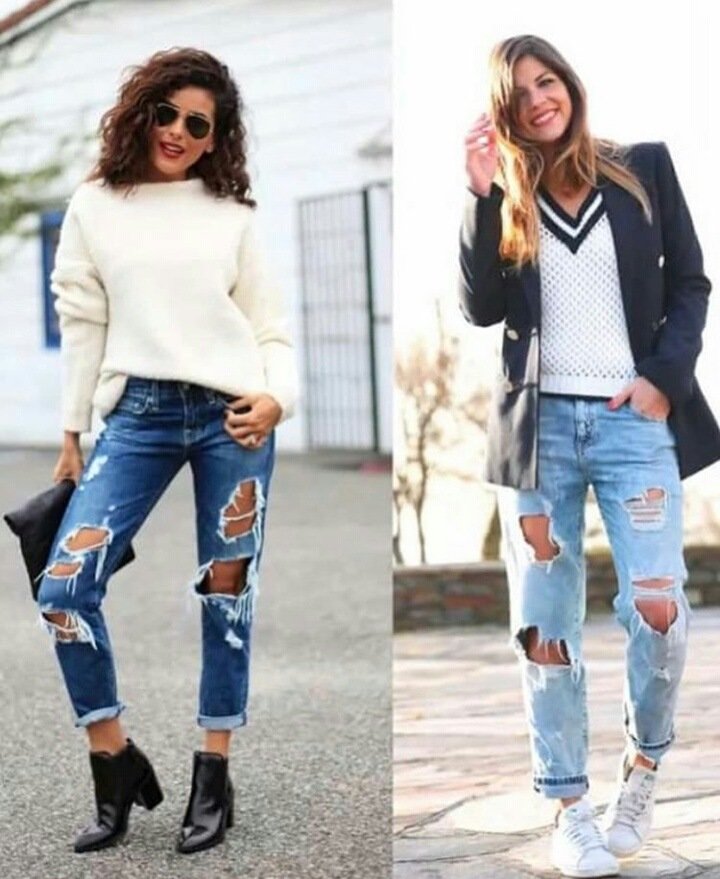 Так, например, если нужно создать casual-лук, то джинсы мом лучше сочетать со спортивной обувью типа кроссовок, слипонов – весной, со шлепками с широкой лямкой или босоножками на плоской подошве – летом, с ботинками – осенью и зимой.