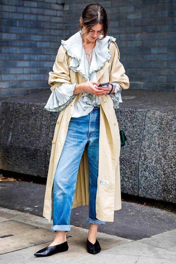 Как было отмечено выше, от выбора обуви зависит весь образ с джинсами мом, поэтому если вы собрались надеть лодочки на каблуке под данную модель джинсов, то естественно будет надеть сверху пальто или пиджак.