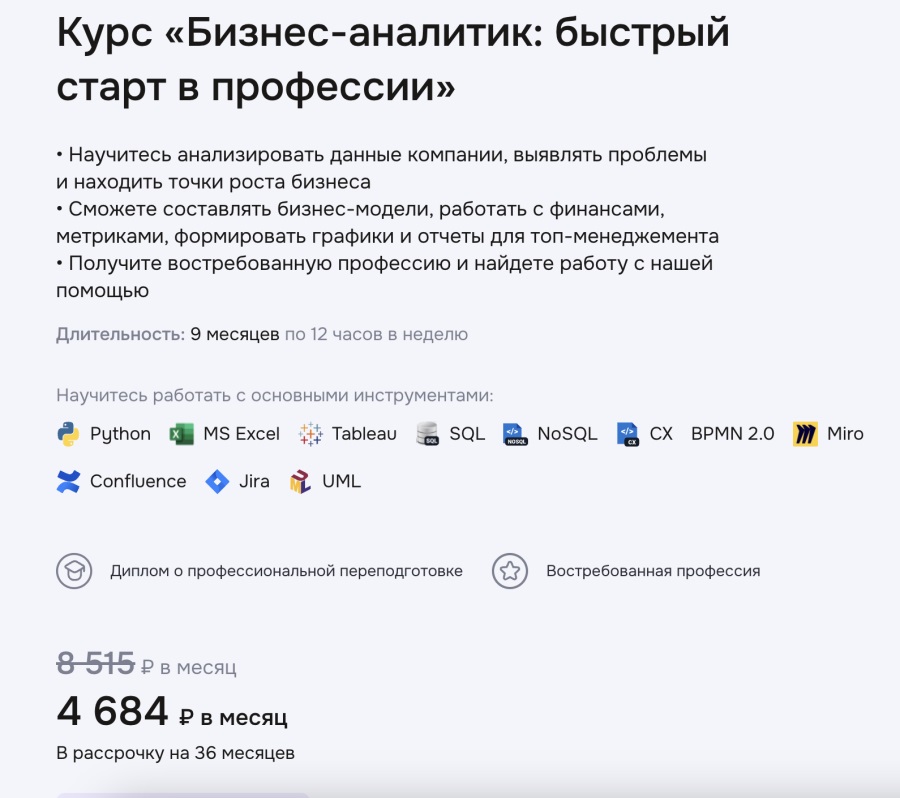 Освоенные вами инструменты — Tableau, MS Excel, Power BI, Python, SQL, NoSQL, Miro, CXBPMN 2.0, Jira, Confluence, UML — помогут вам достичь высокого уровня профессионализма. А навыки, которые вы приобретете, откроют двери к карьерным вершинам: