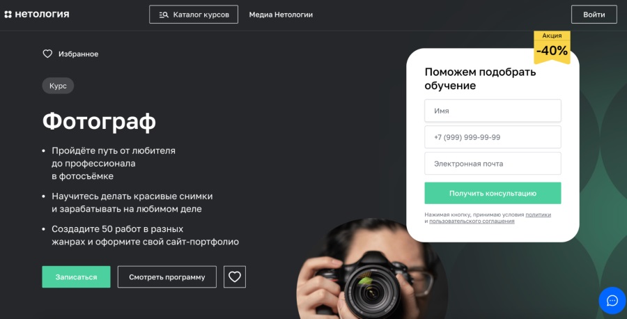 - 6 основных: “Фотография с нуля 2.0”, “Фотография PRO”, “Предметная фотография”, “Capture One”, “Искусство коммуникации”, “Food-фотография”;