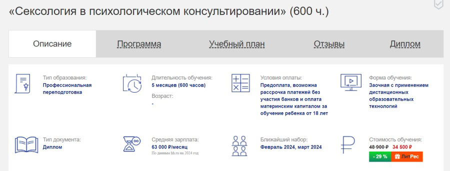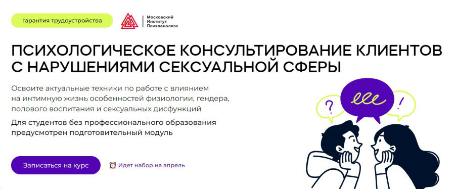 Более простой и короткий путь лежит к специальности сексолога-консультанта. Достаточно пройти 3-6-месячные онлайн-курсы по сексологии и получить диплом с присвоением соответствующей квалификации. Такое образование ориентировано на практику, предполагает удобный онлайн-формат с гибким графиком занятий, позволяющим совмещать учебу с работой и личной жизнью. На многих курсах гарантируется стажировка и трудоустройство, предоставляется помощь в поиске клиентов и создании личного бренда.