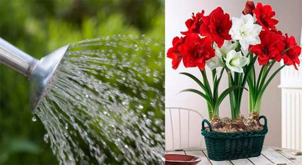 Гиппеаструм рекомендуется поливать в поддон отстоявшейся, дождевой или талой водой комнатной температуры, приблизительно два-три раза в неделю, избегая застоя воды. В период покоя полив полностью прекращается. Когда на луковице появится цветонос и росток достигнет высоты 10 см, полив следует возобновить.