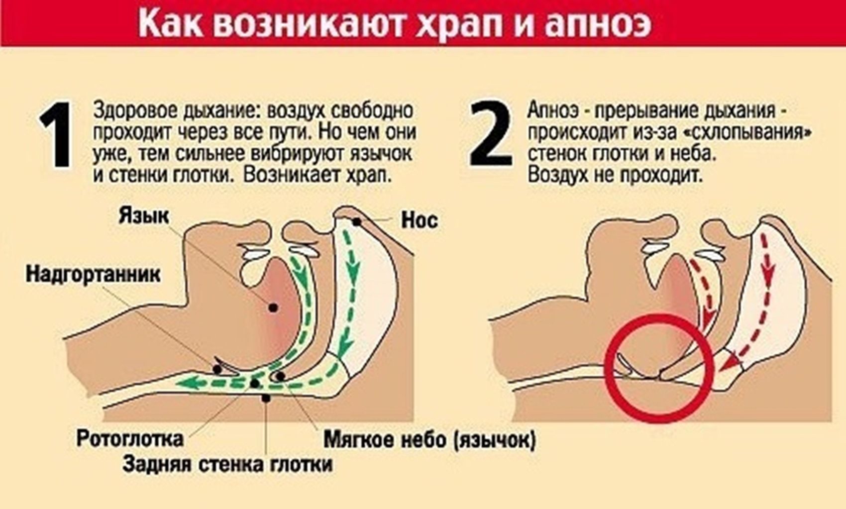 Во сне мягкие ткани нёба, языка и горла расслабляются – иногда настолько, что частично перекрывают дыхательные пути, особенно если человек спит на спине. При прохождении воздуха эти мягкие ткани начинают вибрировать, в результате чего и возникает характерный звук храпа.