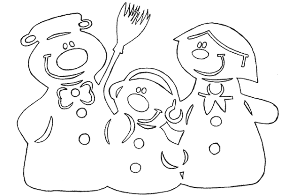 - На ватмане рисуем снеговика и канцелярским ножом вырезаем детали внутри контура, а затем и саму вытынанку.