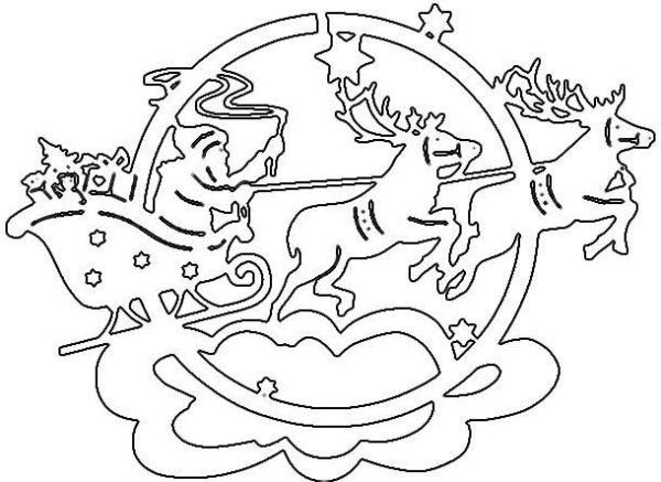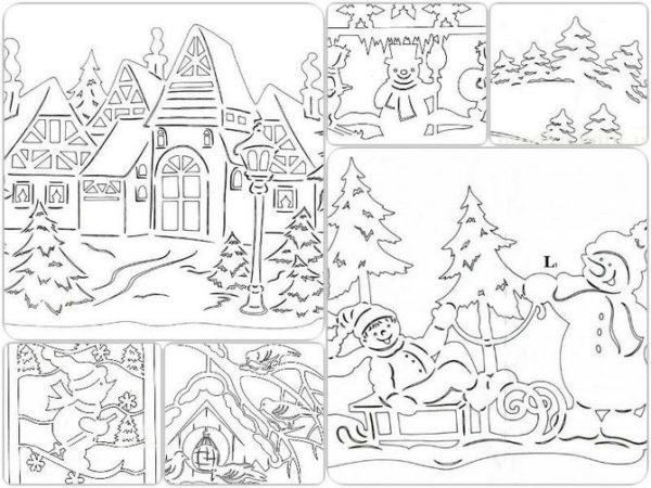 Крупные вытынанки выглядят привлекательно. Это не отдельные фигурки, а целые картины: живописные пейзажи, лошади и олени в упряжках, волшебный лес с домиком, заснеженные деревья с животными или дети, лепящие снеговика.