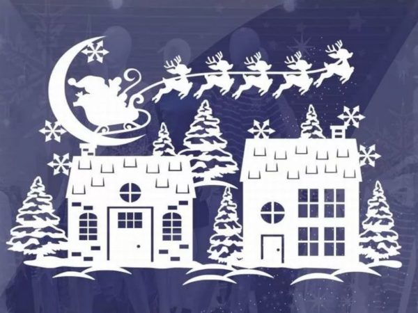 На нижнюю часть окна можно приклеить вытынанки домиков. Разнообразие вариантов позволяет выбрать картинки разной сложности. Например – домики припорошенные снегом и с трубой, из которой идет дым.