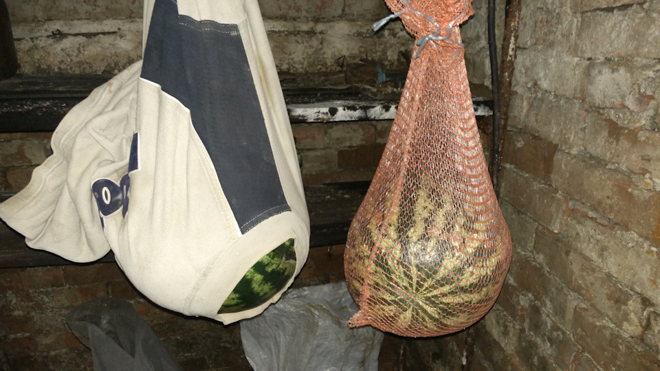 Арбузы лучше хранить в подвешенном состоянии. Если есть достаточно места, выберите этот метод. Чтобы ягода дольше сохраняла свежесть, оберните ее мешковиной или другой натуральной тканью, например, хлопком. Каждый арбуз поместите в отдельную сетку и подвесьте на крючок. Важно, чтобы арбуз не соприкасался со стенами, полом или другими предметами.