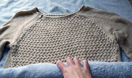 Если растянулась только одна часть изделия (например, нижняя), замочите ее в теплой воде на 15 минут. Затем отожмите и разложите на ровной поверхности. Этот метод подходит и для полной стирки вещи.
