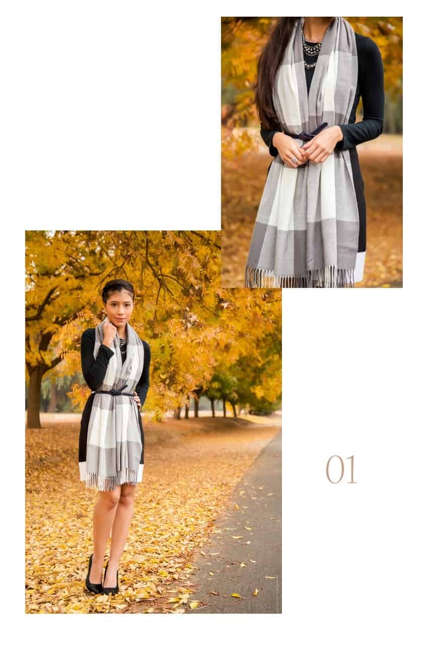 Как в примере № 3 выше, я использовала белый шарф, чтобы создать еще один черно-белый ансамбль, на этот раз для офиса. Этот образ начинался с простого платья, но я добавила красок, надев принтованные туфли на каблуках. Да, шарф красиво сочетается и с платьем! Как я уже говорила, черно-белые ансамбли выделяются осенью, и это великолепный способ произвести впечатление на работе. Попробуйте простую юбку-карандаш в сочетании с блузкой на пуговицах и с шарфом, такое сочетание также будет выглядеть эффектно.