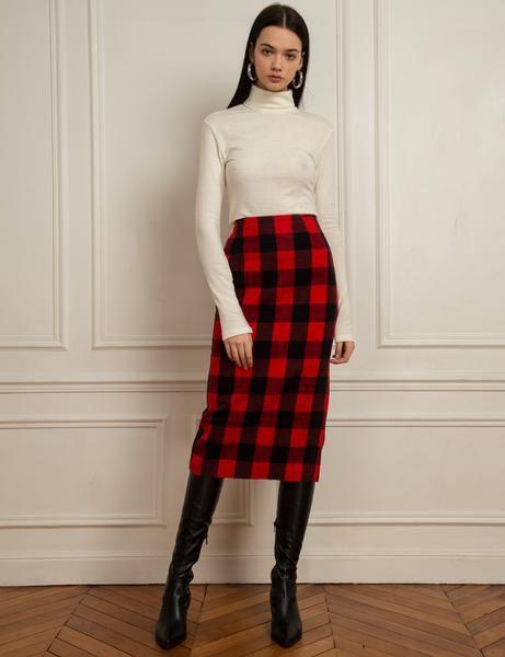 Это лучший выбор для работы, так как ее можно носить со свитерами, блейзерами и рубашками на пуговицах. Попробуйте заправить рубашку с воротником или водолазку в юбку с завышенной талией или надеть свободный джемпер средней длины. Стилизуйте красную юбку-миди в клетку с простой черной водолазкой, дополнив лук черными лакированными ботильонами или сапогами до колена.