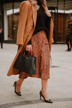 Сочетайте юбку миди с принтом любой длины с длинным пальто из верблюжьей шерсти и высокими сапогами. Зимой пальто-пыльник станет вашим незаменимым спутником, так как оно надежно согревает и защищает все тело, включая ноги.