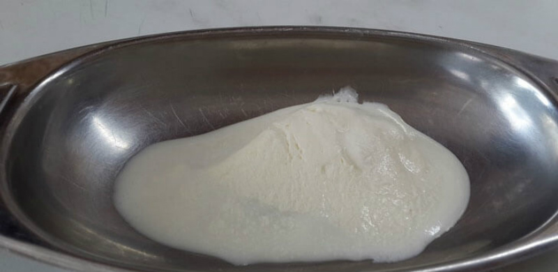 Добавка из плодов масленичной пальмы продлевает срок хранения кисломолочной пищи. Оставьте ложку творога при комнатной температуре на столе. Если длительное время творог сохраняет свою свежесть, но при этом желтеет, в составе есть растительные жиры. Натуральное изделие начнет прокисать, но не изменится в цвете.