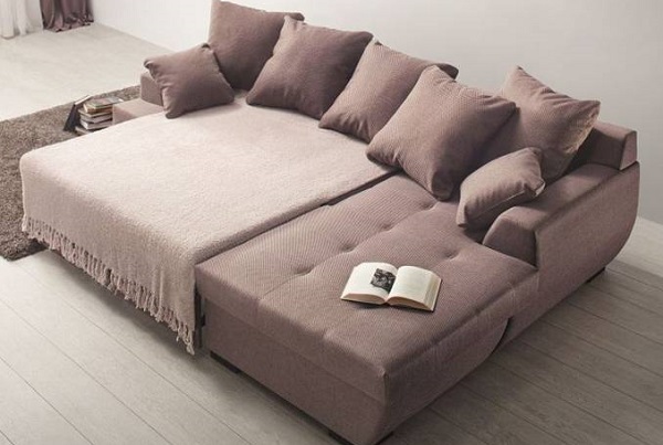 Если в этой же комнате вы работаете или принимаете гостей, возможно, идеальным решением станет покупка углового раскладного дивана. Днем он не занимает все свободное пространство и позволяет спокойно перемещаться, а ночью раскладывается в полноценное спальное место. Лучше выбирать модели, в которых предусмотрена функция регулярного сна, в таких каркас обычно более жесткий. Обивка подойдет более светлая, хотя, если предполагается постоянное использование покрывал и подушек, изголовье и подлокотники могут быть и потемнее.