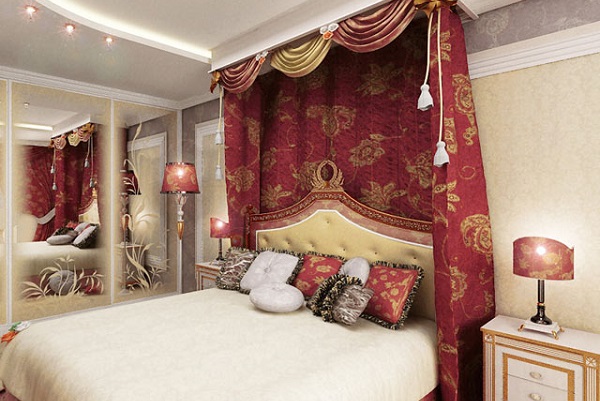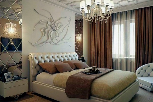 Классика — это строгость и симметричность, которую можно обыграть на современный лад. Пастельные тона, зеркала и витражи для визуального расширения пространства, натуральные отделочные материалы, натуральное дерево, кованые изголовья. Основной акцент делается на кровать, вокруг которой затем обыгрывают остальную обстановку. Здесь нет кричащих тонов и ярких переходов, зато может присутствовать золото и предметы, олицетворяющие роскошь — статуэтки, вазы, камень, роспись на стенах. На потолках — нависающие люстры, на стенах — бра и торшеры.
