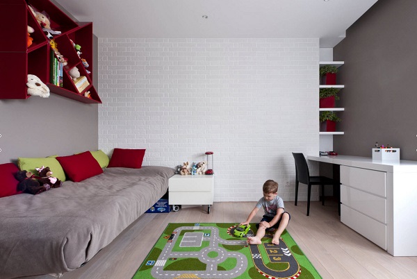 Еще один способ организовать спальное место — соорудить подиум. Это не совсем об экономии пространства, зато позволяет совместить несколько функций на одной площади. Чаще всего этот вариант выбирают, когда нет возможности расположить на 10 м² рабочую зону, место для игр в детской или стол для занятий школьника. Прибегают также к такому виду мебели тогда, когда необходимо организовать большое количество вещей — книги, белье, игрушки. Все это хорошо укладывается в выдвижные ящики, предусмотренные заранее.