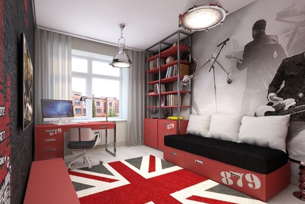 Скорее всего, эта комната объединит в себе место для отдыха, занятий, учебы и встреч с друзьями. Если у молодого человека есть хобби, возможно, понадобится место для музыкальных инструментов, спортивного тренажера, скейтборда или лонгборда, боксерской груши. Для отделки подойдут немаркие материалы приглушенных оттенков. Возможно, лучшим решением будет соорудить подиум, снабженный удобной системой для хранения или выбрать кровать-трансформер.