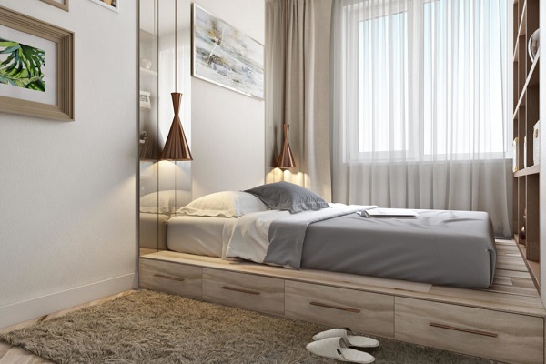 Объемная мебель не подходит для небольших помещений. Лучше выбирать легкие и практичные варианты, которые не перегрузят интерьер. Подойдут трансформируемые модели и подиумы, а также многофункциональные предметы, экономящие пространство. Вместо традиционных шкафов и тумб можно использовать выдвижные и встроенные ящики, антресоли и полки, а также пространство под окнами.