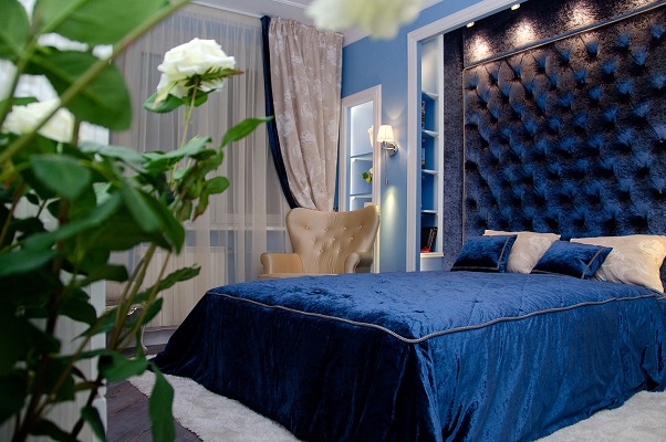 Море — такие ассоциации возникают у большинства при виде синих оттенков. А еще это уединение, созерцание, безмятежность — идеальное сочетание для спальни, в которой хочется отдыхать и набираться сил. Тем, кто занят интеллектуальным трудом такое оформление позволит отрешиться от напряженных мыслей и переключиться на волну успокоения и релакса. Не стоит выбирать глубокие и яркие нотки «электрик» в качестве основных, он будет уместен как дополнение к более спокойным серо-голубому, бирюзовому, васильковому, небесному, лазурно-серому. На северной стороне лучше использовать теплые оттенки, для южной можно остановить свой выбор на холодной палитре. Для сочетания хороши белый, коричневый, черный, бежевый, серый, иногда желтый, зеленый, оранжевый.
