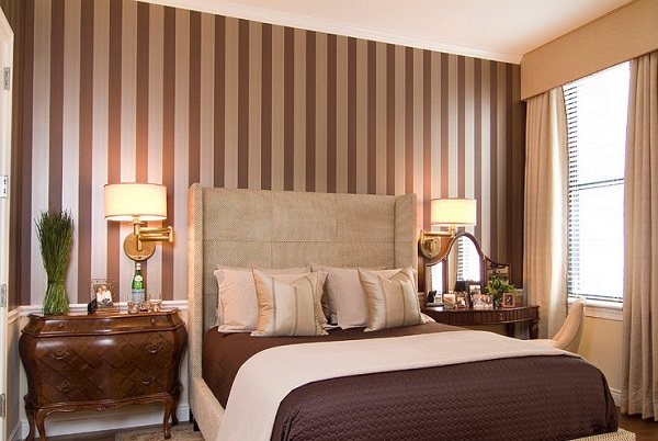 Светлые тона и зрительные иллюзии в виде полосок могут стать помощниками при оформлении маленькой спальни в 10 м². Горизонтальные полоски лучше в узкой комнате, а вертикальные зрительно увеличат потолки. Можно поклеить обои, нанести декоративную штукатурку, использовать деревянные панели или просто окрасить краской. Фотообои и ткань тоже возможны, но выбирать рисунок стоит очень тщательно, чтобы он был не слишком крупным и выделяющимся.