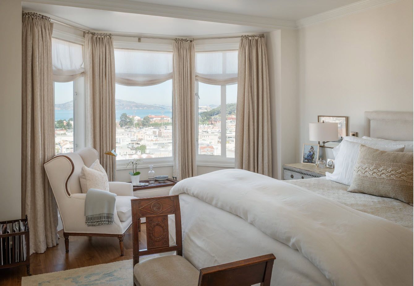 Это пространство можно отдать как под кровать, так и под зону отдыха. Чаще всего в ней ставят удобный, полукруглый диван или пару кресел, и небольшой, журнальный столик.