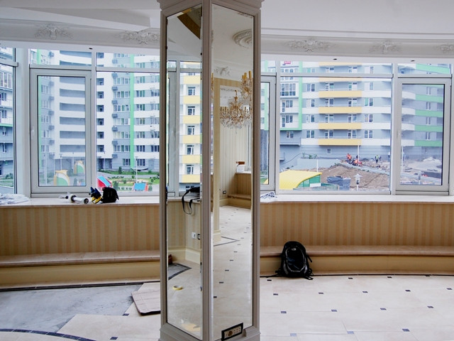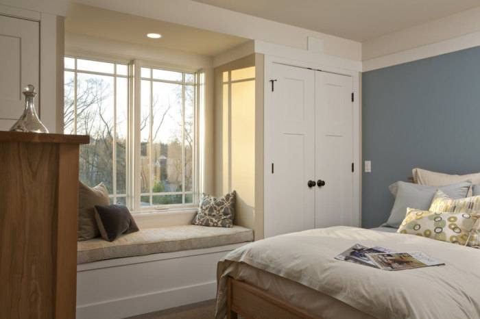 В квартирах такое оформление возможно при наличии широких подоконников или эркеров, что позволяет установить банкетку или мягкую скамью.