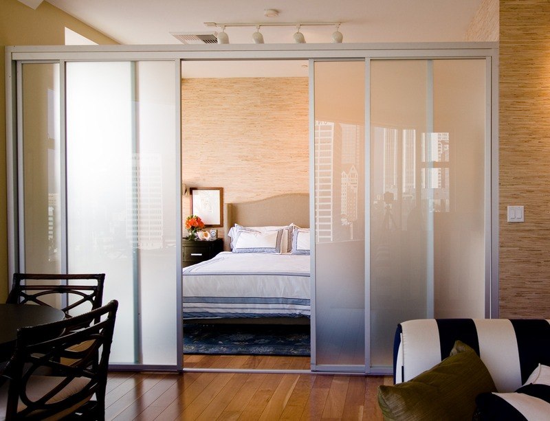 Полупрозрачные перегородки обычно используют в однокомнатной квартире молодые супружеские пары, у которых пока еще нет детей. Таким способом можно отделить пространство со спальным местом и, в то же время, сохранить его целостность.