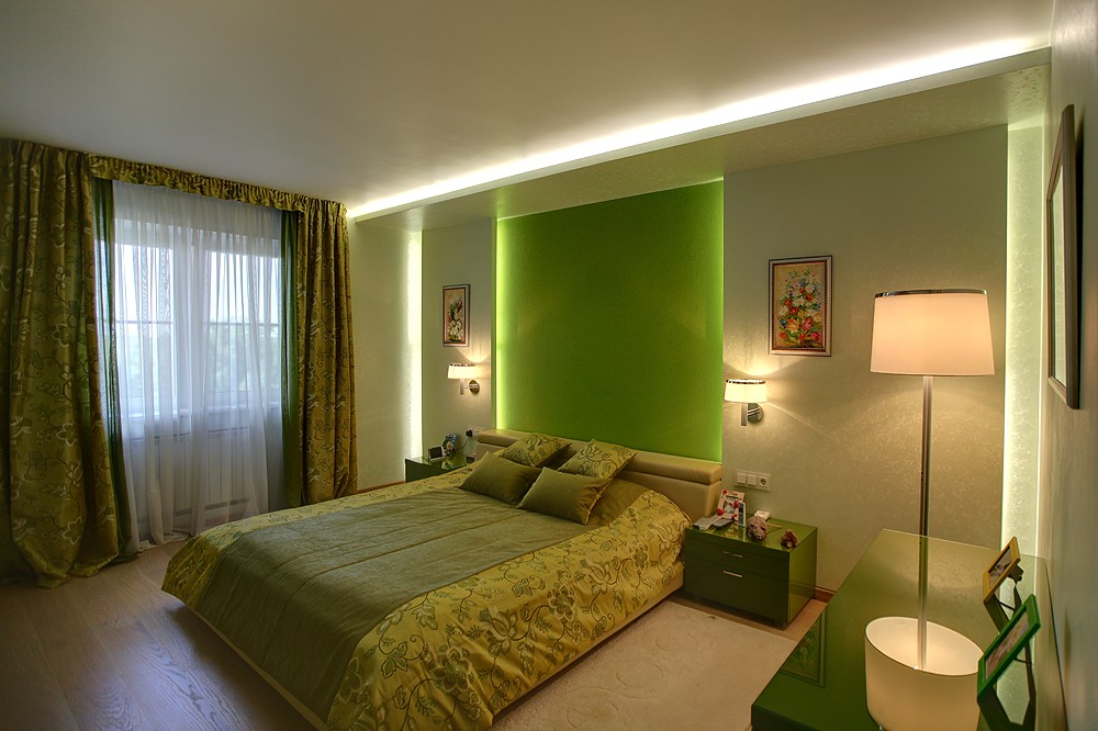 Ненавязчивый зеленый цвет обладает успокаивающим действием. Он воспринимается человеком как продолжение пейзажа за окном. Тон выбранного цвета может отличаться на тех или иных объектах. Например, шторы и покрывала выбираются более темные, обои и напольный ковер чуть светлее. Или, наоборот.