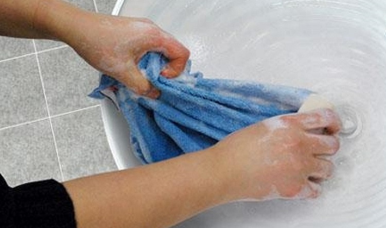 Сначала замочите полотенце на полчаса в теплой воде с небольшим количеством моющего средства.