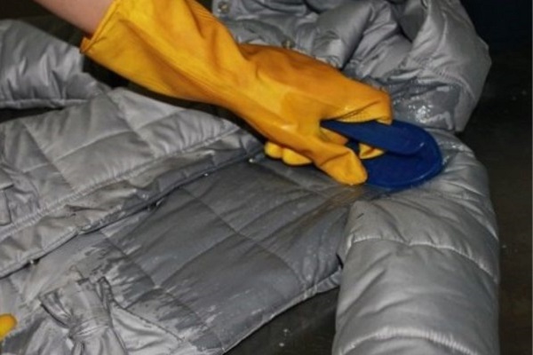 - Нанести на загрязненные участки пуховика чистой губкой;