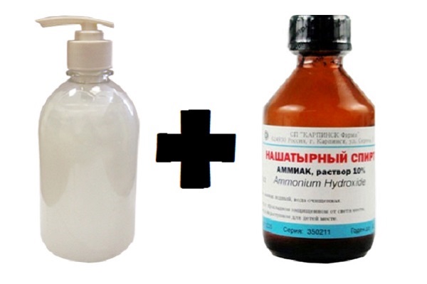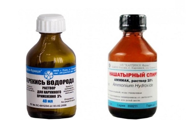 - Смешайте перекись водорода с нашатырным спиртом в равных пропорциях.