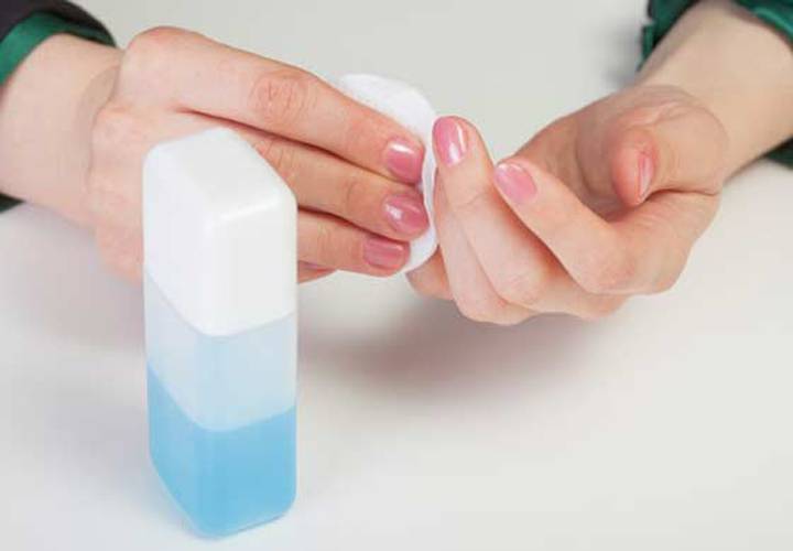 Отдавайте предпочтение средству, не имеющему в составе ацетона, оно быстро отмоет застарелые, въевшиеся пятна. Способ не подходит для чистки окрашенных аксессуаров, а только прозрачных или белых. Смочите спонжик жидкостью, протрите всю поверхность или участки с пятнами, сразу же помойте футляр водой.