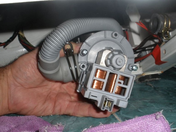 Каждая модель стиральной машины имеет схожий процесс слива отработанной воды. Он осуществляется по одному принципу: электродвигатель небольшой мощности приводит в движение крыльчатку, соединенную с пластиковым патрубком-улиткой. При неправильной эксплуатации в машину могут попасть мелкие предметы — пуговицы, волокна ткани, волосы, монеты. Эти частицы могут заблокировать крыльчатку, что приведет к поломке сливного насоса.