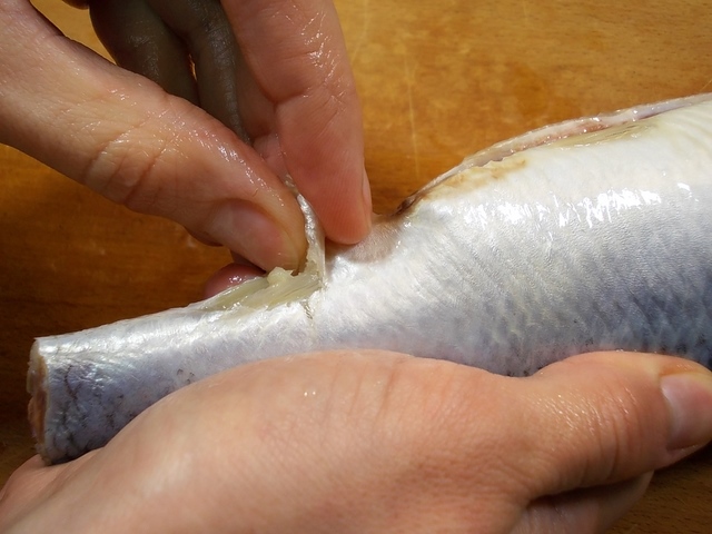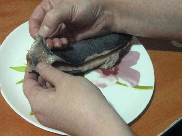 Проведите пальцами вдоль хребта, разделив сельдь на две части. Хребет останется на одной из половинок. Отделите его и с помощью пинцета извлеките мелкие косточки.
