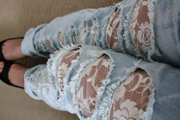 Кружево превосходно дополняет потрепанности и дырки в джинсах. Оно нашивается с внутренней стороны изделия и скрывает оголенные участки тела. Кроме того, такие вставки не позволяют поврежденной джинсовой ткани деформироваться, расползтись и увеличиться в размере.