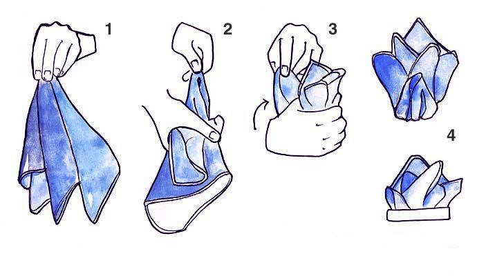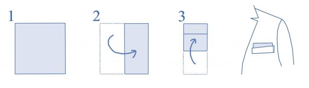 Количество сгибов зависит от размера платка и ширины кармана, Края не должны выступать больше, чем на 2 см., чтобы они не сгибались, а оставались ровными.