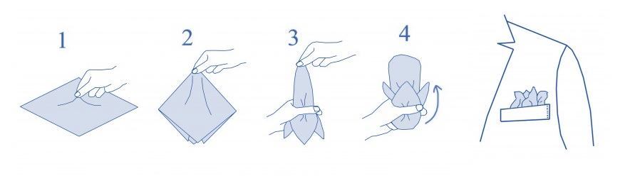 Сначала аккуратно подцепите платок, ухватившись двумя пальцами за его центр. Затем встряхните его и пропустите через кольцо, построенное большим и указательным пальцами. После этого заверните нижнюю часть платка вверх и вставьте платок в карман пиджака.