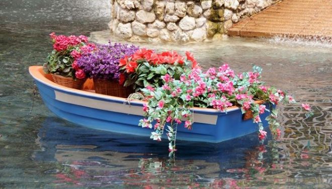 - Заполните лодку землей и высадите цветы. Затем спустите ее на воду и надежно закрепите канатом. Оригинальное украшение готово.