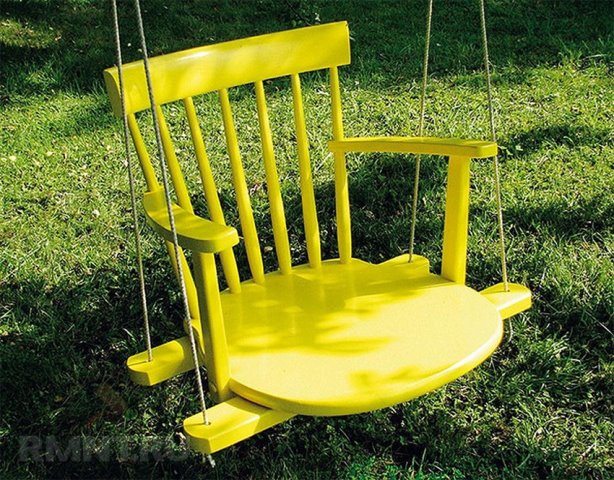 Сидение изготовляется из старых досок. Предварительно их приводят в порядок – счищают старую краску, затирают, покрывают новой краской, а поверх – лаком. Осталось плотно соединить сидение и веревки. Качели готовы.