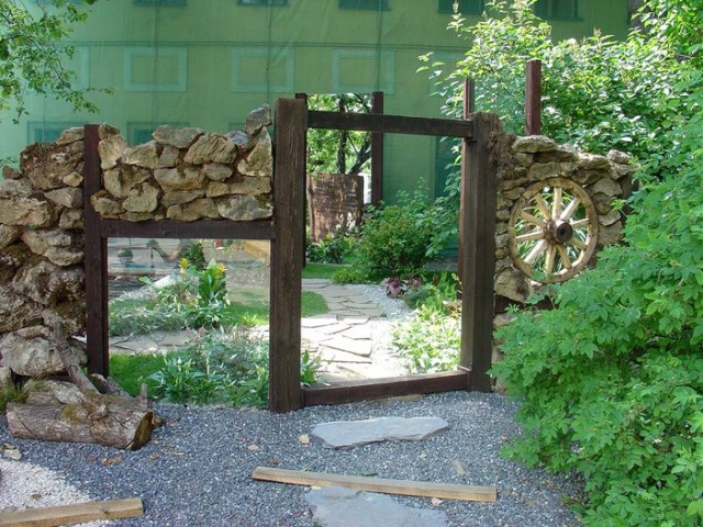 Второй способ преобразить двор частного дома — использовать старые зеркала. Эти ненужные предметы можно превратить в оригинальный элемент декора. На изображении ниже показано, как зеркала могут визуально увеличить даже самый маленький участок, если развесить их по периметру.