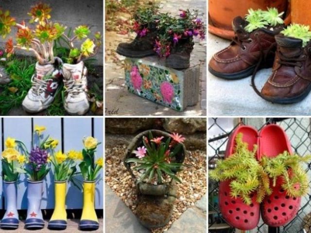 Работа основана на принципе старой лодки и цветника. Вместо лодки используйте старую обувь, которая уже не нужна.