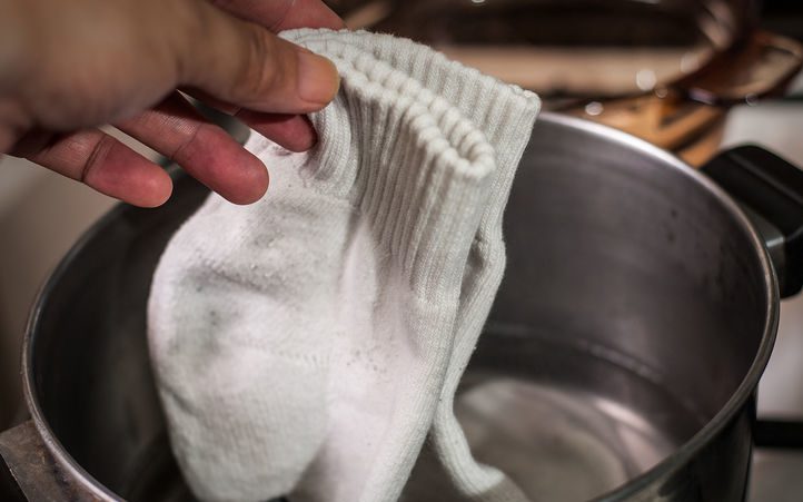 Кипячение белых вещей для отбеливания использовали наши прабабушки. Этот метод подходит для хлопчатобумажных носочков. Возьмите ненужную кастрюлю или металлический контейнер, наполните его водой наполовину и поставьте на плиту. Добавьте полстакана уксуса. Когда вода закипит, опустите носки и кипятите 5 минут. Не вытаскивайте их сразу, дайте воде остыть до 30-40 °С. Затем постирайте носки с порошком или мылом.