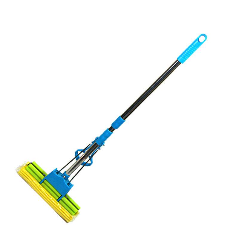 Швабра с губчатой насадкой и телескопической ручкой. С помощью такой ручки можно регулировать длину. Моп сделан из поролона. Он может быть круглой, овальной или прямоугольной формы. В модели предусмотрен отжимной механизм. Такая швабра подойдёт для уборки линолеума в небольшой квартире. Поролон склонен к изнашиванию, но губку можно легко заменить.