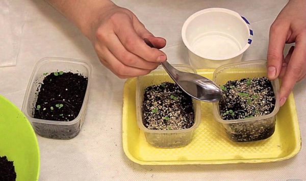 Вытянувшиеся сеянцы заглубляют до семядольных долей. Распикированные кустики поливают и при необходимости в емкости добавляют субстрат.