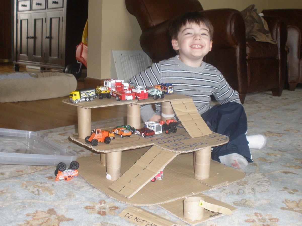 - горка для игрушек, машинок. Вырежьте детали стенок, помоста с покатом. Сделайте прорези в элементах, закрепите их. Дайте ребенку раскрасить готовую самоделку карандашами, красками;