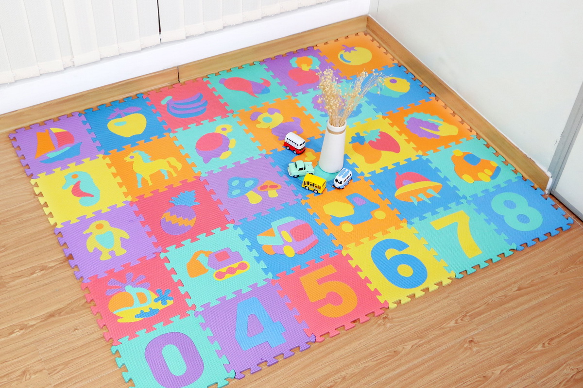 - Для малышей до 3 лет коврик помогает познавать мир, учиться ходить, бережет от царапин и ушибов. Чтобы заинтересовать детей, лучше выбирать яркие варианты, привлекающие внимание, с рисунками сказочных героев, цифрами или алфавитом для изучения.
